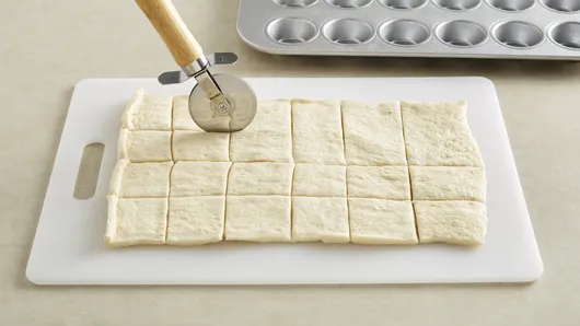 Step2Unroll dough on work surface. Press into 12x9-inch rectangle. If using crescent roll dough, firmly press perforations to seal. With pizza cutter or sharp knife, cut into 6 rows by 4 rows to make 24 squares.