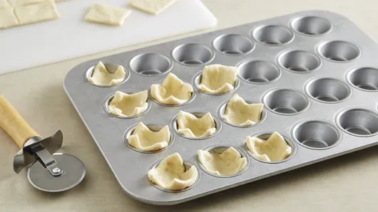 Step3Gently press squares into muffin cups (dough will not completely cover inside of cup; do not press too much). Bake 6 to 8 minutes or until edges are golden brown. Cool in pans 10 minutes. Remove from pans. Cool completely, about 10 minutes.