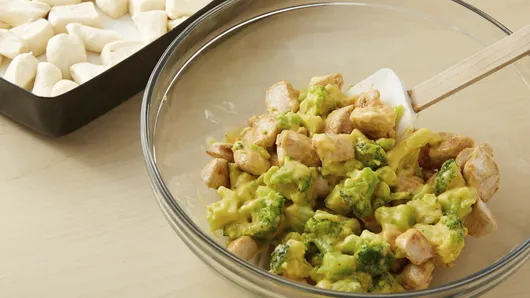 Step4Microwave frozen broccoli and cheese sauce as directed on box. Place cooked broccoli with cheese sauce in large bowl. Add cooked chicken; stir to combine.