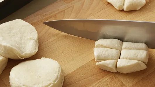 Step2Separate dough into 8 biscuits; cut each into 8 pieces. Spread biscuit pieces evenly in baking dish.