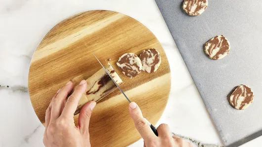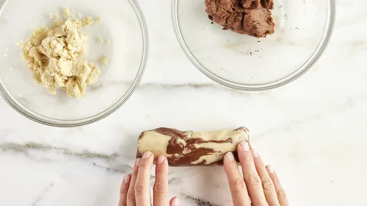 Divide each of the doughs in half. Take one half of each of the sugar and cocoa cookie doughs, and press together into a ball. Gently knead to mix doughs (don’t overwork dough or it will lose marbling). Press combined doughs back into a ball.