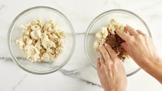 Divide cookie dough in half. In medium bowl, place half of the cookie dough. Crumble cookie dough; stir or knead in flour until well mixed. (DO NOT EAT RAW COOKIE DOUGH AFTER COMBINING WITH FLOUR.) In another medium bowl, place remaining half of cookie dough. Crumble cookie dough; stir or knead in cocoa until well mixed.
