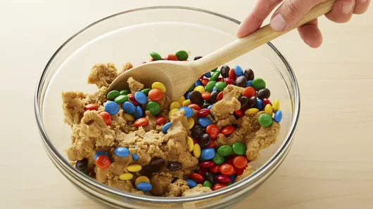 Step2In medium bowl, crumble cookie dough; stir or knead in candies until well mixed. Reserve 1 cup of the dough. Press remaining dough evenly in ungreased 8-inch square pan. Bake 15 minutes.