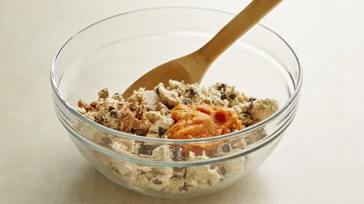 Heat oven to 350°F. In large bowl, break cookie dough into small chunks. Add pumpkin and pumpkin pie spice; stir with wooden spoon until well mixed.