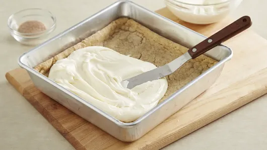 Step4Meanwhile, in small bowl, stir remaining 1/4 teaspoon cinnamon and the sugar until well blended. Spread frosting on bars. Sprinkle with cinnamon-sugar. For bars, cut into 4 rows by 4 rows.