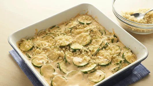 Step5Bake 15 minutes; top with bread crumb mixture. Bake 10 to 15 minutes or until bread crumbs start to brown and zucchini is tender.