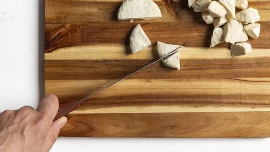 Cut each biscuit in half lengthwise, and cut each half into 4 pieces.