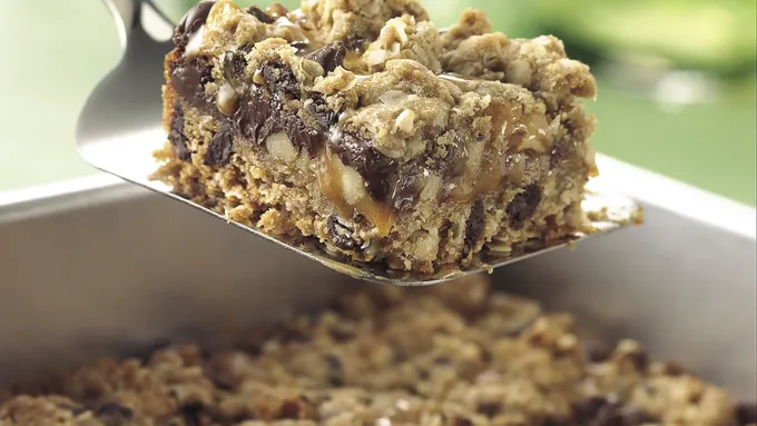 Step2In medium bowl, mix cookie dough and oats, kneading until well mixed. Reserve 3/4 cup of the mixture. Press remaining in bottom of pan. Bake about 15 minutes or until light golden brown.