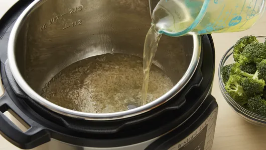 Spray 6-quart Instant Pot® insert with cooking spray. Mix broth, rice, salt and pepper in insert.