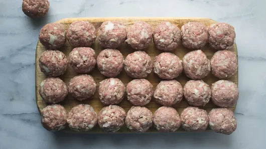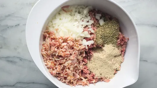 Step3Chop bacon into very small pieces; add to beef mixture. Using clean hands, mix beef mixture, making sure all ingredients are evenly distributed. Portion into about 30 (2-oz) pieces. Roll each piece into a ball.