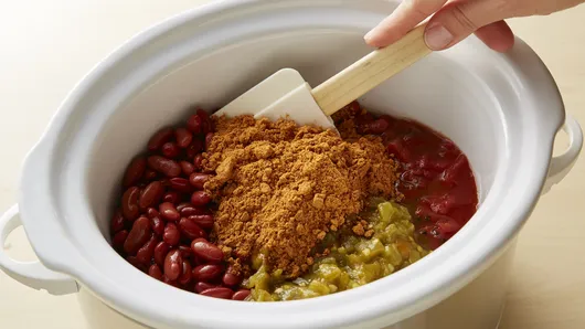 Step1Spray 5-quart slow cooker with cooking spray. Mix beans, tomatoes, chiles and taco seasoning mixes in cooker.