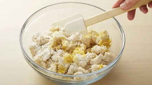 Step2In medium bowl, break up cookie dough. Add flour and grated lemon peel; mix or knead until well blended. (DO NOT EAT RAW COOKIE DOUGH AFTER COMBINING WITH FLOUR.) Press 1 1/4 cups of the mixture into pan. Bake 15 minutes.