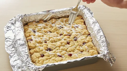 Step3In small bowl, mix jam and 1 teaspoon of the lemon juice; carefully spread jam on top of bar base. Crumble remaining cookie dough mixture on jam layer. Bake 25 to 30 minutes or until cookie dough top is golden brown. Cool completely, about 1 hour 30 minutes.