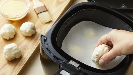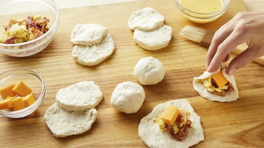 var configuration = {"title":"Air Fryer Bacon and Egg Breakfast Biscuit Bombs","introduction":"Trust us—you\u0027re going to love these air fryer breakfast biscuit bombs! Prepped with just five ingredients, including crisp bacon and melty cheese, these stuffed biscuits are made quick and easy in the air fryer for a satisfying on-the-go breakfast. ","servingSize":"1 Biscuit Bomb","image":{"small":{"media":"(min-width: 0px)","src":"https://mojo.generalmills.com/api/public/content/9SgTu2RWDEuItTECibuVUw_webp_base.webp?v=1072580f\u0026t=e724eca7b3c24a8aaa6e089ed9e611fd"},"medium":{"media":"(min-width: 500px)","src":"https://mojo.generalmills.com/api/public/content/9SgTu2RWDEuItTECibuVUw_webp_base.webp?v=1072580f\u0026t=191ddcab8d1c415fa10fa00a14351227"},"large":{"media":"(min-width: 767px)","src":"https://mojo.generalmills.com/api/public/content/9SgTu2RWDEuItTECibuVUw_webp_base.webp?v=1072580f\u0026t=191ddcab8d1c415fa10fa00a14351227"},"alt":"Air Fryer Bacon and Egg Breakfast Biscuit Bombs"},"contributor":{"label":"By","name":"Pillsbury Kitchens","profileUrl":"/about-us","displayDate":{"label":"Updated","date":"Dec 6, 2021"}},"ingredientGroups":[{"name":"Biscuit Bombs","ingredients":[{"quantity":"4 ","description":" slices bacon, cut into 1/2-inch pieces "},{"quantity":"1 ","description":" tablespoon butter "},{"quantity":"2 ","description":" eggs, beaten "},{"quantity":"1/4 ","description":" teaspoon pepper "},{"quantity":"1 ","description":" can (10.2 oz) refrigerated Pillsbury™ Grands!™ Southern Homestyle Buttermilk Biscuits (5 Count) ","productLink":"/products/biscuits/grands-refrigerated-biscuits/homestyle-buttermilk"},{"quantity":"2 ","description":" oz sharp cheddar cheese, cut into ten 3/4-inch cubes "}]},{"name":"Egg Wash","ingredients":[{"quantity":"1 ","description":" egg "},{"quantity":"1 ","description":" tablespoon water "}]}],"steps":[{"description":"Cut two 8-inch rounds of cooking parchment paper. Place one round in bottom of air fryer basket. Spray with cooking spray."},{"description":"In 10-inch nonstick skillet, cook bacon over medium-high heat until crisp. Remove from pan; place on paper towel. Carefully wipe skillet with paper towel. Add butter to skillet; melt over medium heat. Add 2 beaten eggs and pepper to skillet; cook until eggs are thickened but still moist, stirring frequently. Remove from heat; stir in bacon. Cool 5 minutes.","stepShotImageUrl":"//mojo.generalmills.com/api/public/content/hhIt8x2nJUmOdab_ghAvNw_webp_base.webp?v=2627e4bf\u0026t=51a43a57af4046789e5a7f20567b1195"},{"description":"Meanwhile, separate dough into 5 biscuits; separate each biscuit into 2 layers. Press each into 4-inch round. Spoon 1 heaping tablespoonful egg mixture onto center of each round. Top with one piece of the cheese. Gently fold edges up and over filling; pinch to seal. In small bowl, beat remaining egg and water. Brush biscuits on all sides with egg wash.","stepShotImageUrl":"//mojo.generalmills.com/api/public/content/JUcT1iN3fkCPi6rSUFiFLQ_webp_base.webp?v=05b4ad68\u0026t=51a43a57af4046789e5a7f20567b1195"},{"description":"Place 5 of the biscuit bombs, seam sides down, on parchment in air fryer basket. Spray both sides of second parchment round with cooking spray. Top biscuit bombs in basket with second parchment round, then top with remaining 5 biscuit bombs.","stepShotImageUrl":"//mojo.generalmills.com/api/public/content/uEwFflXSRkuAPQ2vfkvm_Q_webp_base.webp?v=1e3df0b0\u0026t=51a43a57af4046789e5a7f20567b1195"},{"description":"Set to 325°F; cook 8 minutes. Remove top parchment round; using tongs, carefully turn biscuits, and place in basket in single layer. Cook 4 to 6 minutes longer or until cooked through (at least 165°F).","stepShotImageUrl":"//mojo.generalmills.com/api/public/content/IYuxcM_MnU6hH4tmjoJFag_webp_base.webp?v=04be37fb\u0026t=51a43a57af4046789e5a7f20567b1195"}],"tips":[{"title":"","description":"Air fryer temperature control settings vary according to brand and model. If your air fryer does not have the exact temperature setting called for in the recipe, consult your manual for suggested temperature settings.","category":"Techniques","tipShots":[]},{"title":"","description":"Our recipes do not call for preheating your air fryer. Just set the temperature, and start. Never preheat with parchment paper alone.","category":"Techniques","tipShots":[]},{"title":"","description":"Swap the cheese for another variety, such as pepper Jack.","category":"Serving Suggestions/Menu","tipShots":[]},{"title":"","description":"Kitchen Tested - 6/2019","category":"Kitchen Tested","tipShots":[]}],"kitchenTips":[{"title":"","description":"Air fryer temperature control settings vary according to brand and model. If your air fryer does not have the exact temperature setting called for in the recipe, consult your manual for suggested temperature settings.","category":"Techniques","tipShots":[]},{"title":"","description":"Our recipes do not call for preheating your air fryer. Just set the temperature, and start. Never preheat with parchment paper alone.","category":"Techniques","tipShots":[]},{"title":"","description":"Swap the cheese for another variety, such as pepper Jack.","category":"Serving Suggestions/Menu","tipShots":[]}],"additionalContent":[],"faq":[],"tipCategories":[{"categoryName":"Kitchen Tested","heading":"More About This Recipe","cssClass":"recipePartStory","expandOnInit":false,"expandText":"More +","collapseText":"Less -","expandEventName":"","collapseEventName":"","image":"","tips":[{"title":"","description":"Kitchen Tested - 6/2019","category":"Kitchen Tested","tipShots":[]}],"isExpandable":false}],"nutritionInfo":{"configuration":{"showAsTable":false,"noNutritionInformationAvailableMessage":"No nutrition information available for this recipe","poweredByText":"\u003cp\u003eNutrition information for this recipe is estimated using a leading nutrition calculation application, but is an estimate only. Actual nutrition values will vary based on the exact ingredie