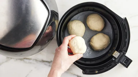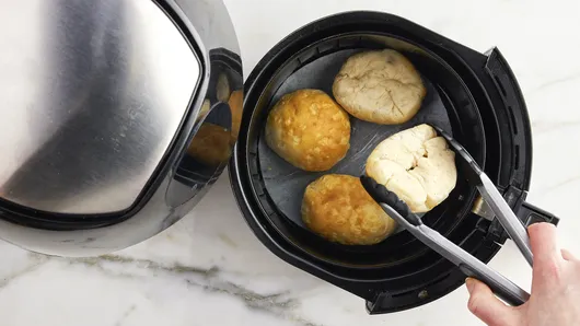 Cut 8-inch round of cooking parchment paper. Place in bottom of air fryer basket. Spray with cooking spray. Place 4 biscuit bombs, seam sides down, onto parchment round in basket of air fryer, spacing apart.