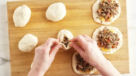 Separate dough into 8 biscuits. Press each biscuit into 5-inch round. Place 2 quartered pieces of American cheese into center of each round. Place about 1/4 cup beef mixture into center of each round. Gently fold edges up and over filling; pinch to seal.