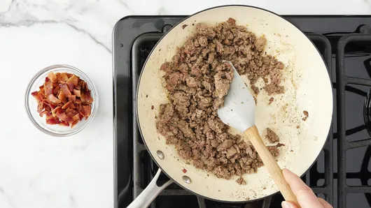In 10-inch skillet, cook beef and steak seasoning over medium-high heat 5 to 6 minutes, stirring occasionally, until beef is brown; drain. Cool 5 minutes. Stir in bacon.