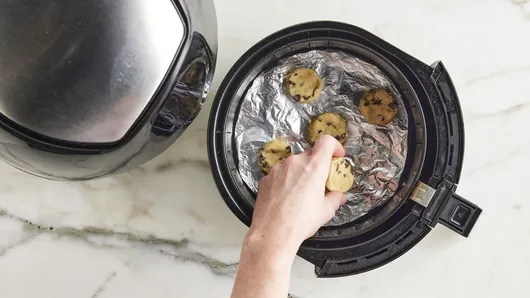 Remove 5 cookie dough rounds from package; refrigerate remaining cookie dough rounds for another use. Flatten each cookie dough round in palm of hand to about 1 1/2-inch circle; place on foil in air fryer basket, spacing evenly apart around outer edge.