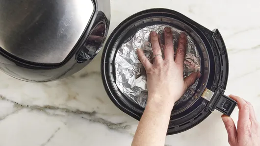 Line inside of air fryer basket with foil as follows: Turn basket of 3.7-quart air fryer over to shape piece of foil around basket bottom, then remove. Fold edges of foil to make 8-inch round. Place inside bottom of air fryer basket, shiny side up; flatten evenly.
