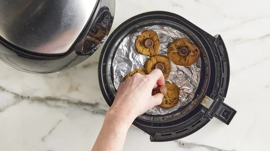 Set air fryer to 300°F; cook 13 to 14 minutes or until edges are set (centers will be soft). Remove basket; place 1 candy in center of each cookie. Let cookies stand in basket 5 minutes. Carefully remove cookies on foil from basket to cooling rack, using spatula to help lift foil out of basket if needed. Cool 15 minutes on foil before removing.