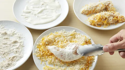 Step2In shallow dish, mix flour and seasoning. In another shallow dish, place ranch dressing. In third shallow dish, mix bread crumbs and cheddar cheese. Coat chicken with flour mixture; dip into ranch dressing, then coat with bread crumb mixture, pressing to adhere.