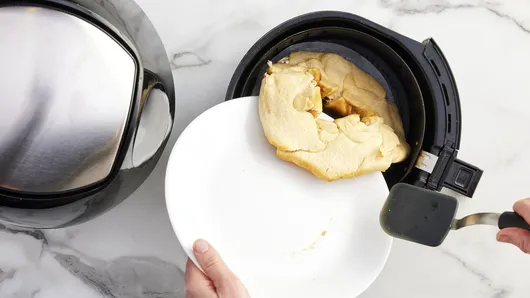 Set air fryer to 325°F; cook 8 to 9 minutes or until top of dough is golden brown. Place a large plate over air fryer basket, and invert. Discard parchment paper.