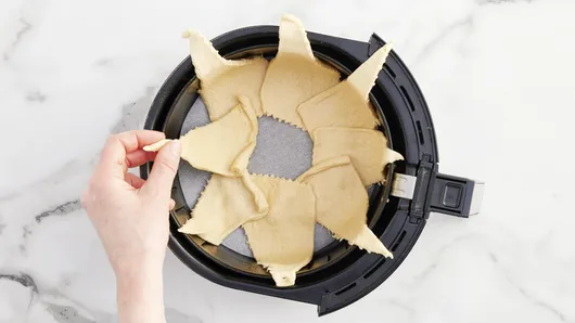 Unroll dough; separate into 8 triangles. On parchment paper in air fryer basket, arrange triangles in ring so short sides of triangles form 2-inch circle in center. Dough will overlap. Dough ring should look like the sun.