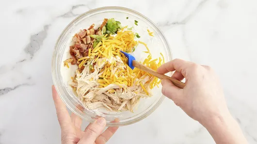In medium microwavable bowl, mix cream cheese spread, milk and ranch seasoning mix. Microwave uncovered on High 20 to 40 seconds or until heated slightly. Beat with whisk until smooth. Stir in chicken, cheese, bacon and green onions.