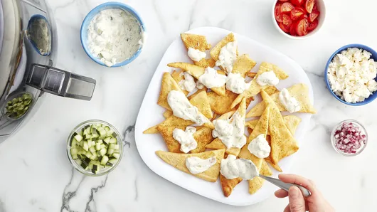 Delicious crescent dough transforms into savory Greek nachos with the help of your air fryer! Simply make your crescent chips, and top them with flavorful favorites like feta cheese, tzatziki dip, tomatoes, cucumber and onion. You'll love that you can get this yummy snack or appetizer on the table in just 35 minutes.