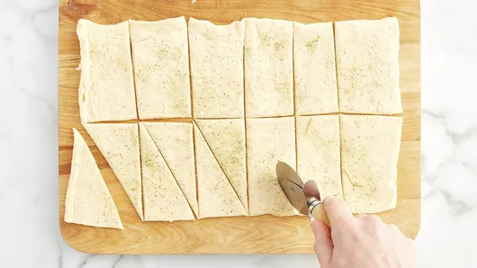 Step1If using dough sheet: Unroll dough; press into 12x8-inch rectangle. Sprinkle with Greek seasoning. Cut in half lengthwise, then in sixths crosswise. Cut each smaller rectangle in half diagonally to make 24 triangles. If using crescent rolls: Unroll dough; separate into 8 triangles; cut each into 3 smaller triangles, to make 24 triangles (triangles will be shaped slightly differently).