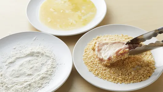 Step2In shallow dish, place flour. In another shallow dish, beat egg with salt. In third shallow dish, mix bread crumbs and Parmesan cheese. Coat pork with flour; dip into egg mixture, then coat with bread crumb mixture, pressing to adhere.