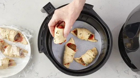 Place 4 crescent rolls point side down on parchment paper in air fryer basket. Cover remaining crescent rolls with plastic wrap, and refrigerate.