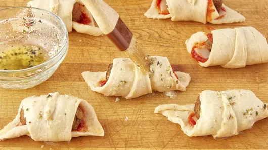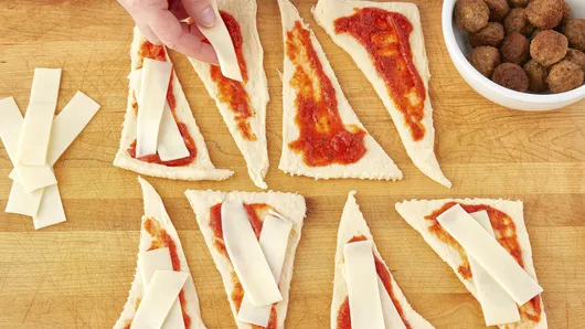 Unroll dough; separate into 8 triangles. Spread 1/2 teaspoon pizza sauce on each triangle. Top each with 2 strips cheese and 2 meatballs.