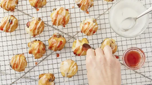In two separate small microwavable bowls, microwave jelly and biscuit icing separately uncovered on High 5 to 10 seconds or until stirred smooth and thin enough to drizzle. Before serving, drizzle biscuit bombs with jam and icing.