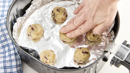 Air fryers with strong fans can cause excess foil to fall, covering cookies in air fryer. If this happens, try using a piece of foil in the basket with less excess foil on the sides.
