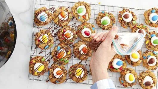 Break out the marshmallows, chocolate chips and milk chocolate almond candies—and get ready for one extra-delicious, extra-unique dessert. Family-favorite ice cream toppings combine with Pillsbury™ Ready to Bake!™ Chocolate Chip Cookie Dough for a sweet treat made in the air fryer. These cookies are great on their own or as a showstopping addition to a dessert platter.