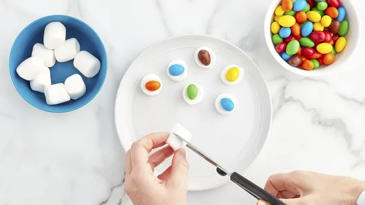 Step2Spray blades of kitchen scissors with cooking spray. Cut marshmallows in half; press one chocolate almond candy into each cut side. Place cut side up on plate. Repeat with remaining marshmallow halves and chocolate almond candies. Set aside.