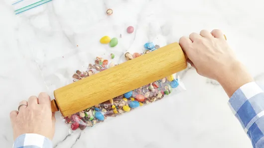 Step3Place remaining chocolate almond candies in resealable food-storage plastic bag; seal bag. Using rolling pin, coarsely crush candy into smaller pieces; pour into small bowl. Set aside.