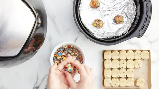 Step4Press and roll each cookie dough round in candy pieces, and shape into balls. Place 6 cookie dough balls on foil in air fryer basket, spacing evenly apart. Discard any remaining candy pieces after rolling cookie dough rounds.