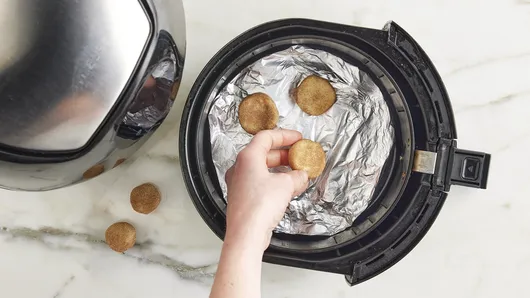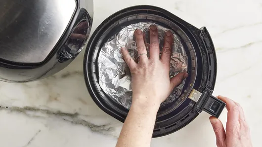 Line inside of air fryer basket with foil as follows: Turn basket of 3.7-quart air fryer over to shape piece of foil around basket bottom, then remove. Fold edges of foil to make 8-inch round. Place inside bottom of air fryer basket, shiny side up; flatten evenly.