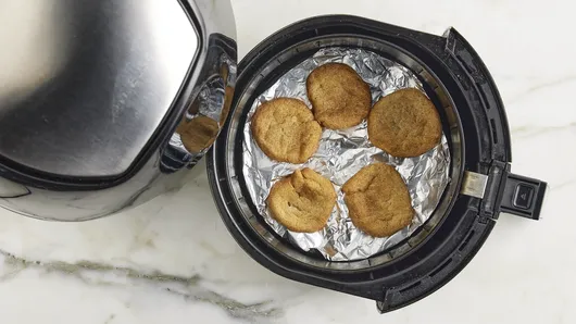 Set air fryer to 300°F; cook 13 to 14 minutes or until edges are set (centers will be soft). Remove basket; let cookies stand in basket 5 minutes. Carefully remove cookies on foil from basket to cooling rack, using spatula to help lift foil out of basket if needed. Cool 15 minutes on foil before removing.