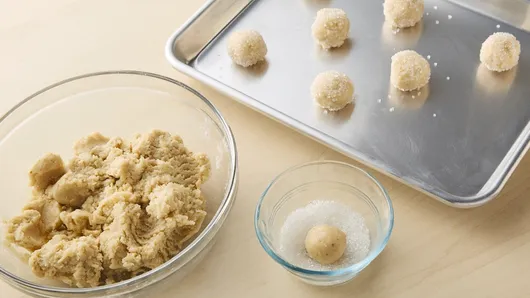 Step4Shape dough into 38 (1-inch) balls. Roll balls in coarse sugar. Place 1 inch apart on ungreased cookie sheets.