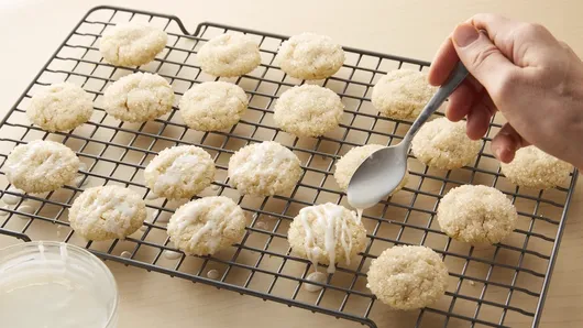 Step6In small bowl, stir powdered sugar, milk and almond extract, adding enough milk for desired drizzling consistency. Drizzle over cooled cookies.