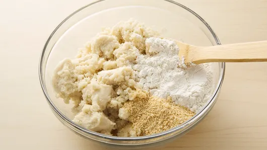 Step3In large bowl, break up cookie dough. Add flour and ground almonds; stir with spoon or hands until well blended. (DO NOT EAT RAW COOKIE DOUGH AFTER COMBINING WITH FLOUR.)