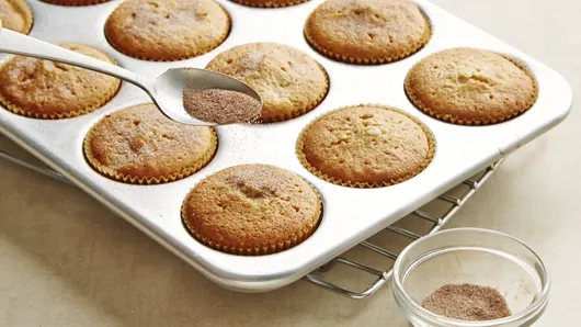 Step4Bake 18 to 28 minutes or until toothpick inserted in center comes out clean. Immediately sprinkle each muffin with cinnamon-sugar mixture. Cool 3 minutes; remove from pan to cooling rack.
