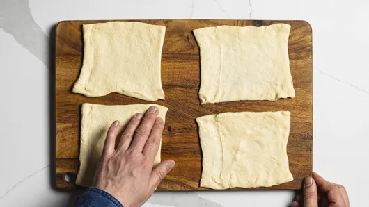 Unroll crescent dough. Separate into 4 rectangles and press into a 6-inch square, pressing the dough perforations to seal them (unless using crescent dough sheet).