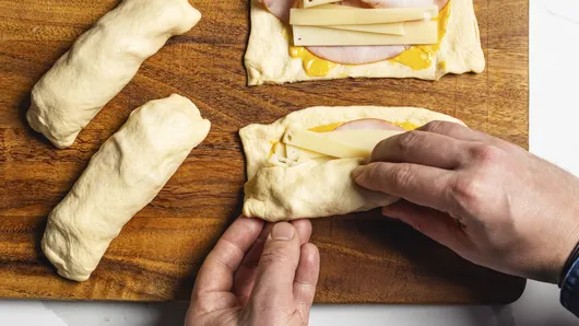 Spread each square with honey mustard, leaving a 1/4-inch margin around the edges. Top with ham and cheese. Roll up the dough with the ham and cheese inside; press to seal ends and seams.