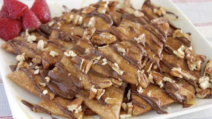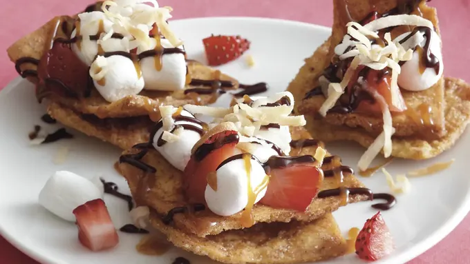 Step1Arrange apple slices on a plate like you would nacho chips. Sprinkle with chocolate chips and coconut.