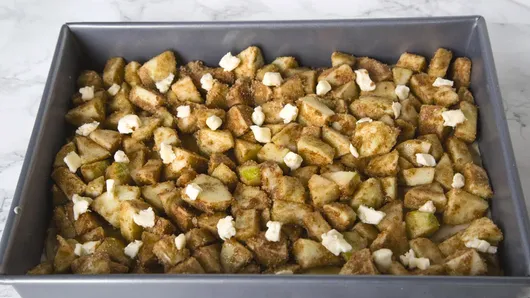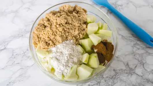 Step2In large bowl, mix 5 cups diced Granny Smith apples, 2/3 cup packed brown sugar, 2 teaspoons apple pie spice and 1/4 cup all-purpose flour.