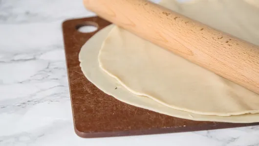 Step3Unroll crusts from 1 box Pillsbury™ refrigerated pie crusts, softened as directed on box, on work surface. Place on top of one another; with rolling pin, roll to fit pan. Press pie crust into bottom of pan to fit.